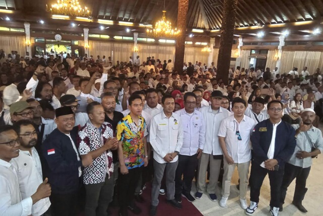 Gibran Rakabuming dengan agenda silaturahmi kumpul sedulur Jateng dengan tema Nyawiji, Tambah Bakoh di Gedung Wanita, Surakarta(5/7/23).